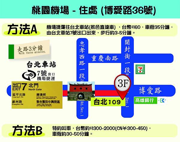 從桃園機場到台北109青旅 109 Hostel Taipei ,可搭乘機場捷運。並在機場捷運的服務台,直接購買悠遊卡(去故宮可以免排隊直接刷悠遊卡、去就九份野柳十分可以直接刷卡搭乘公車、火車、7-11交易、機場捷運都可以使用) 台北桃園國際機場(TPE) → 搭乘機場捷運往”台北車站”(紫色直達車$160)約35分鐘→ 至機場捷運台北車站7號出口 步行約3-5分鐘 → 至住處-台北市中正區博愛路36號3樓(台北109青旅) 台北車站首班車時間:直達車06:00、普通車06:08台北車站末班車時間:直達車22:58、普通車23:05 地址:台北市中正區博愛路36號3樓(台北109青旅,開封街上有電梯,可搭電梯上3樓)→google map>>https://goo.gl/maps/TSKmXzrHsWD2 我們會在旅店等候您喔。